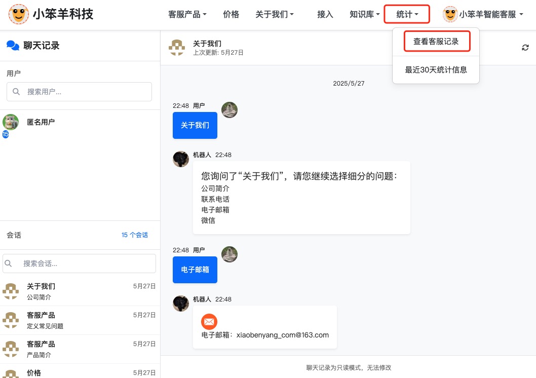 通过客服机器人ID和管理密钥登录后,选择菜单项【统计】➜【查看客服记录】