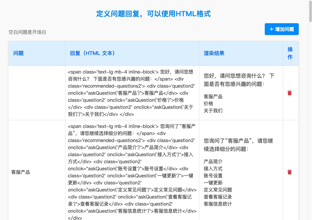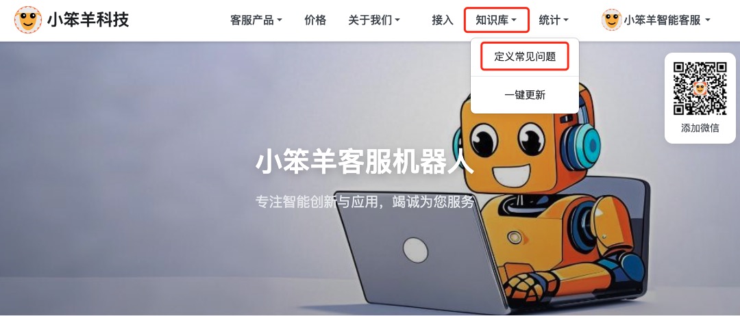 通过客服机器人ID和管理密钥登录后,选择菜单项【知识库】➜【定义常见问题】