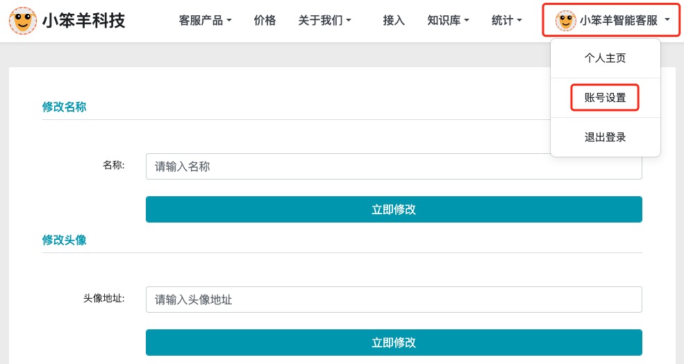 通过客服机器人ID和管理密钥登录后,选择最后一个菜单栏,然后选择子菜单项【账号设置】