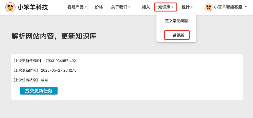 通过客服机器人ID和管理密钥登录后,选择菜单项【知识库】➜【一键更新】