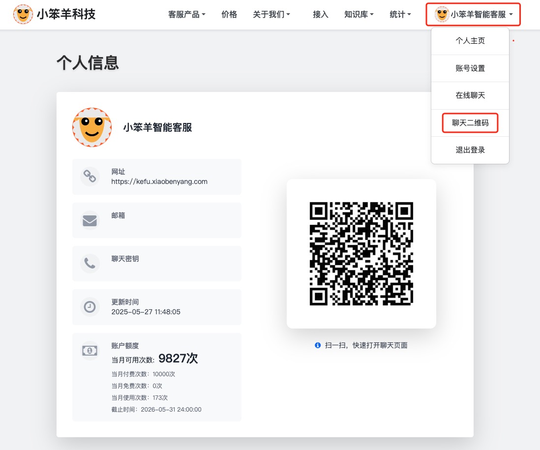 1、通过客服机器人ID和管理密钥登录后,选择最后一个菜单栏,然后选择子菜单项【聊天二维码】,即可看到二维码图片,右键点击保存图片