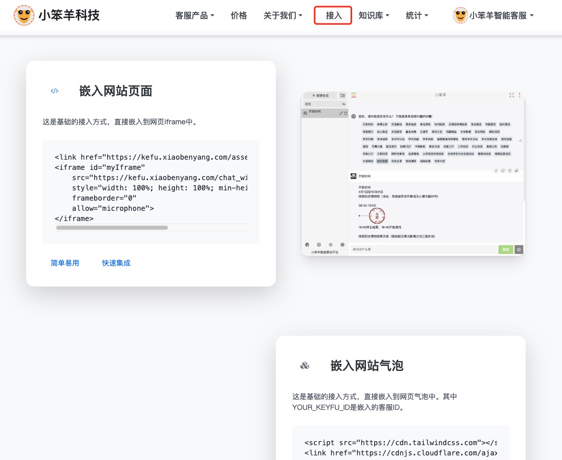 2、可根据需求,选择【嵌入网站页面】、【嵌入网站气泡】或其它的接入方式,复制嵌入页面脚本